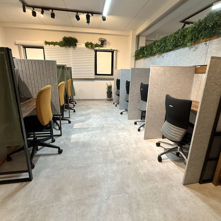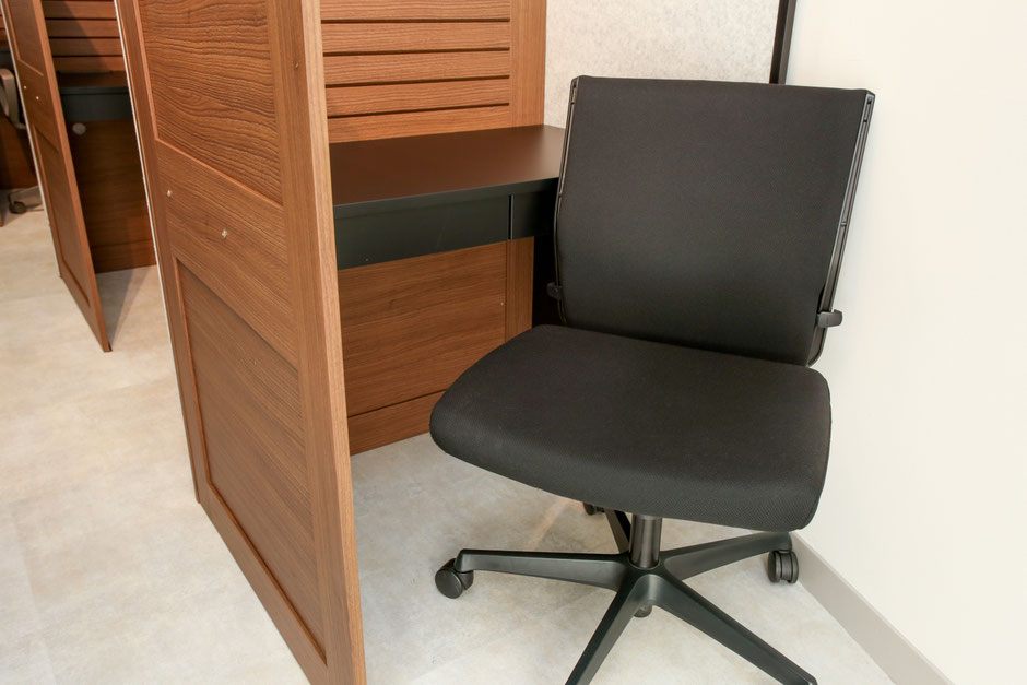 プライバシーに配慮した高さ150cmの間仕切り付き半個室。隣の人を気にせず、没入できる空間設計。長時間の資格試験勉強も快適です。(定額制プラン会員専用/住所利用・郵便物受取可。登記は要審査)